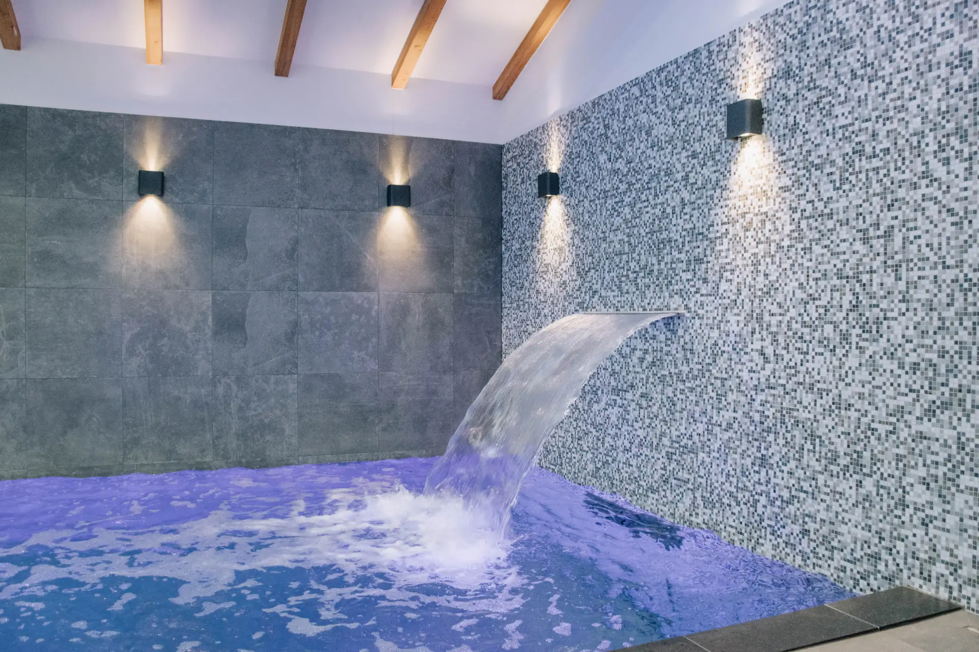 In Apeldoorn hebben we dit luxe betegelde binnenzwembad mogen maken. De mozaïek betegeling en de zwembadverlichting geven het binnenzwembad een luxueuze uitstraling. In het zwembad hebben we ook een hydrostar tegenstroom, een waterval en bubbelbanken verwerkt. Als speciale aanvraag van de klant hebben we 2 sportstrepen in het ontwerp verwerkt die terug te vinden zijn in de gehele tegelvloer.
