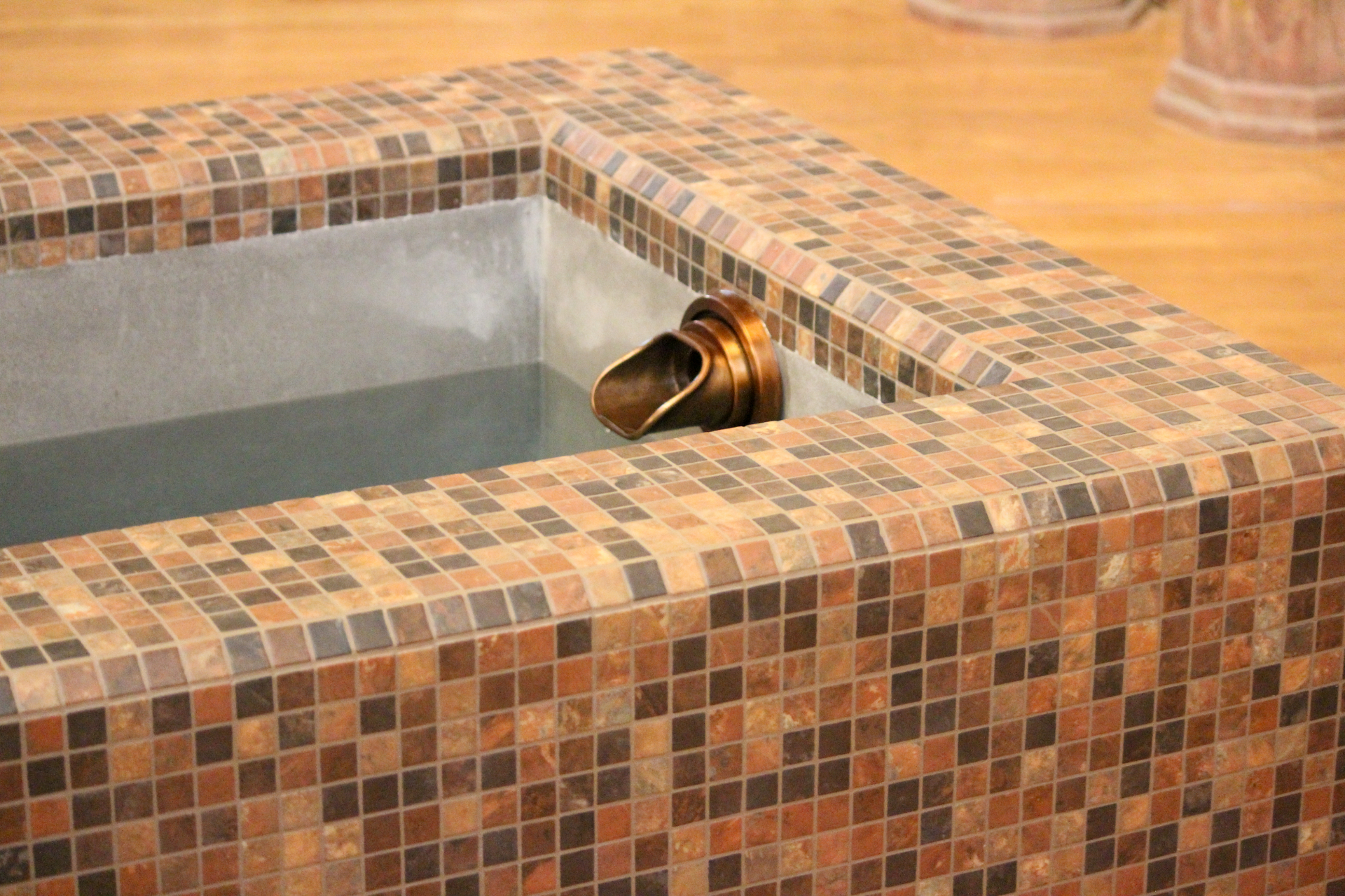 Het doopvont is met precisie betegeld met prachtige mozaïek tegels. De binnenkant is afgewerkt met speciaal pleisterwerk, dat ook voor zwembaden gebruikt wordt. Vandaag hebben we de puntjes op de i gezet. Gaaf om te zien hoe deze materialen zo mooi tot hun recht komen in de kerk.