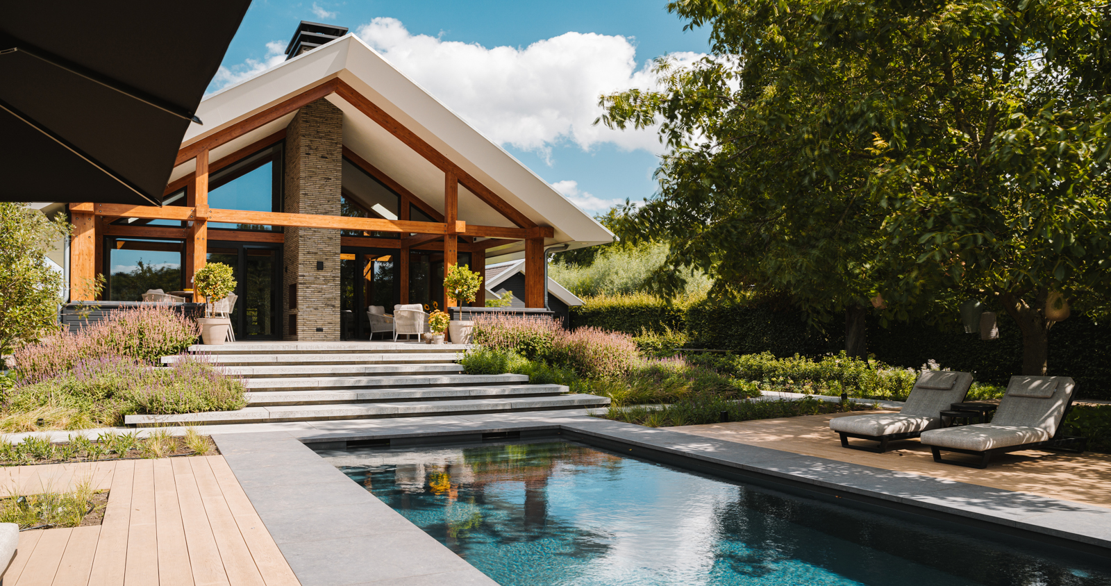 Dit prachtige donkergrijze PPC zwembad in Veenendaal is voorzien van een trap over de volledige breedte. De verdiepte eerste trede fungeert als comfortabel loungeplekje in het water.