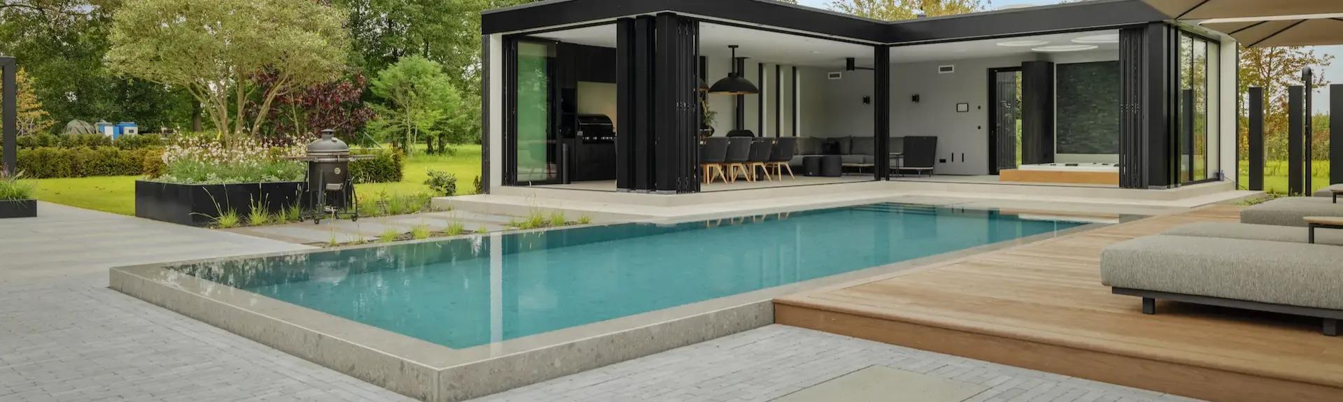 Een overloopzwembad kenmerkt zich door zijn superstrakke uitstraling. Doordat het waterpeil gelijk staat aan het niveau van de bestrating, is er de meest optimale circulatie van water dankzij de overloopgoot. Waterwel werkt met een slim filtratiesysteem en uitgebreide besturing, die u op afstand (middels een app) kunt bedienen. Bijkomend voordeel: hierdoor verspilt u geen onnodige energie. Het oog wil ook wat: het overloopzwembad wordt niet voor niets spiegelbad genoemd. Dankzij de gladde waterspiegel ontstaat een chique en strakke uitstraling. Past dit in uw situatie? Wij maken graag een ontwerp!